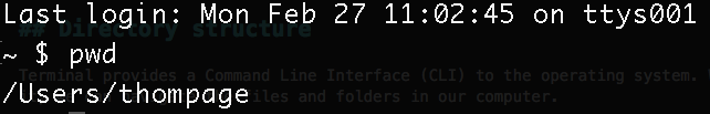 pwd will print the current working directory. It shows you a path. This path shows you where you are currently located in the filesystem. It's like sending up a flare or homing beacon, where you can see how far you have 'traveled' from the root directory.