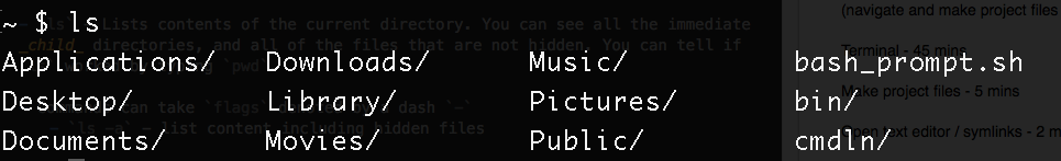 cat filename- concatenate, will show you the contents of the specified filecd- will return to home (cd ~ also works)cd directoryname- change directorycd ..- will go up one directorypwd- Print Working Directory, will show you where you are in your computerls- list, will show you all of the files and folders in the current directorymkdir- Make Directory, creates a new folderrm filename- deletes a file. This is irreversible, the file does not go into the bin, it is gone forever.rmdir directoryname- will delete an empty directory (irreversible)rm -rf directoryname- will delete a directory and all of its files and folders. Does not care if its empty or not. (irreversible)touch filename.extension- creates a file (extension is optional)mv old_file_name new_file_name- rename or move a file or foldercp old_file_name new_file_name- copy a filecode .- open current directory in VSCode