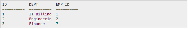 The table has three columns: ID, DEPT, and EMP_ID.