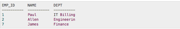 The returned data includes information about EMP_ID, NAME, and DEPT.