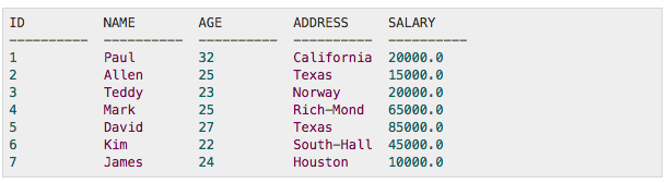 The table has five columns: ID, NAME, AGE, ADDRESS, and SALARY.