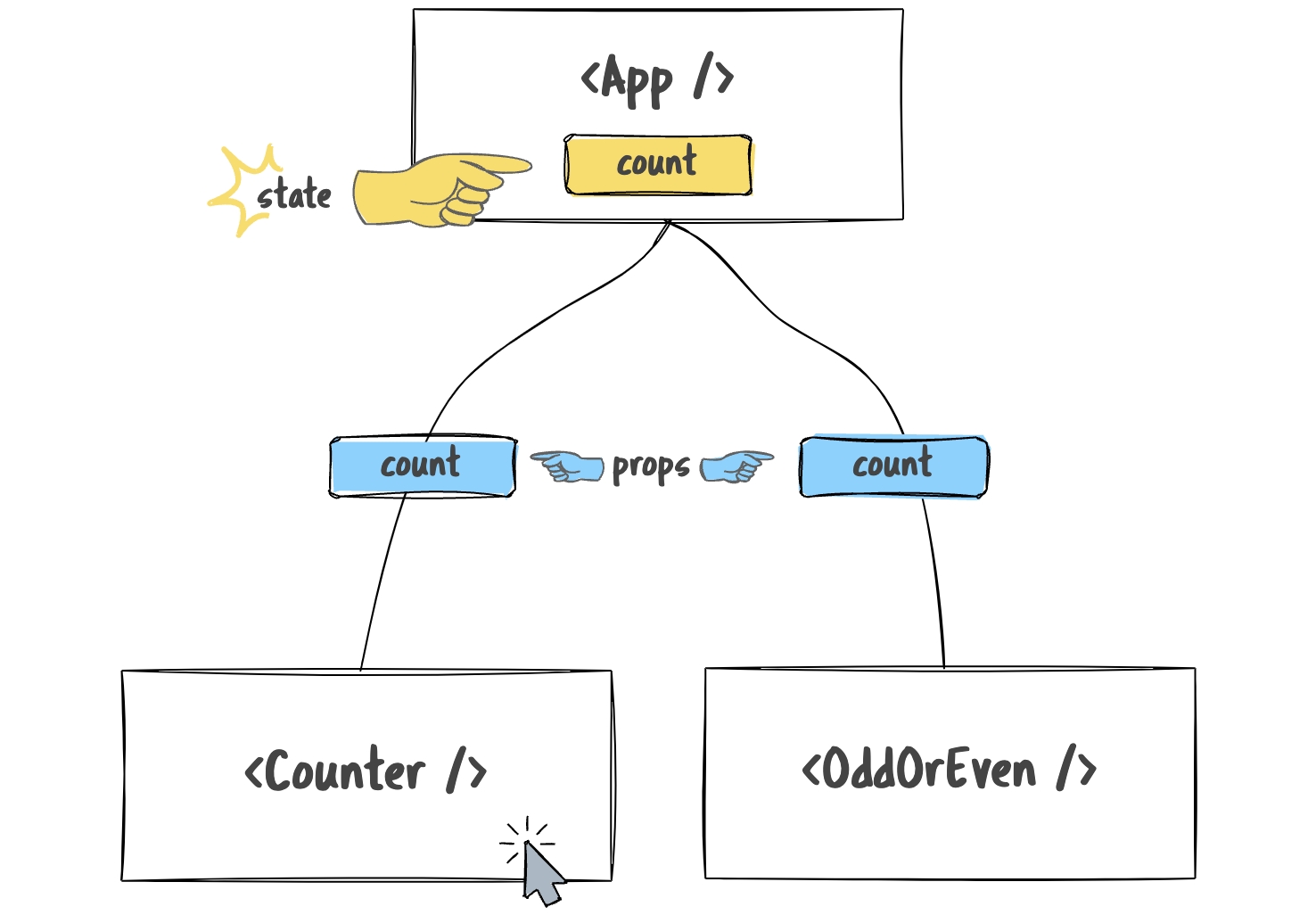 This unidirectional data flow means that when more than one component in our application needs access to state, that shared state needs to be moved up to the closest common ancestor. That ancestor can then pass down the state to the components that need it as props. This is called lifting state up.