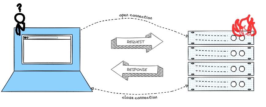 It follows a client-server model where a client (such as a web browser) opens a connection with a web server and makes a request for a resource (such as the homepage/index.html) and then waits for a response from the server.